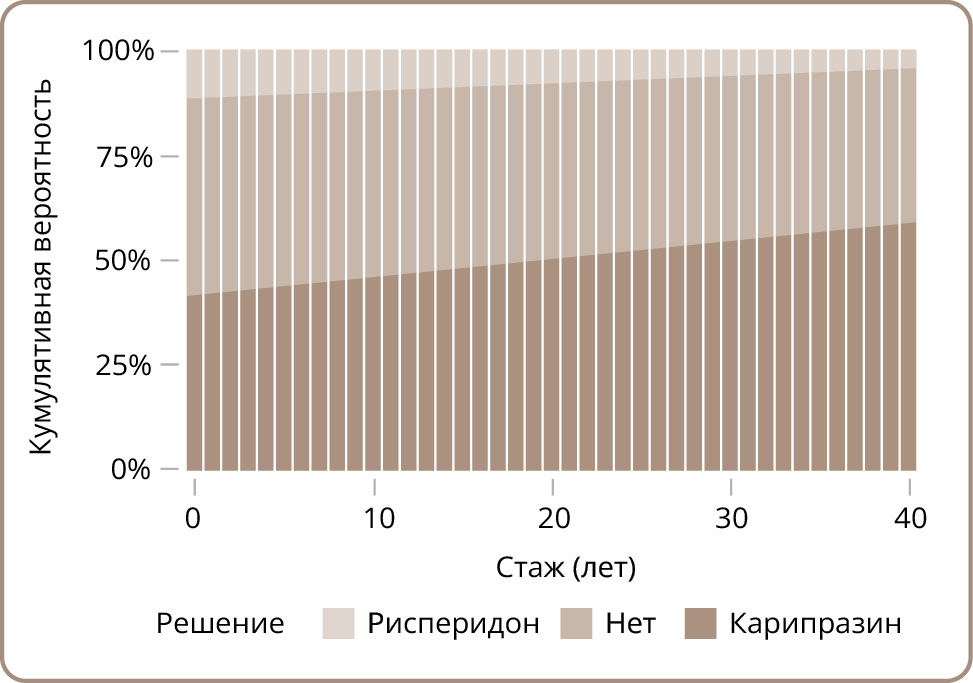 In addition, the hypothesis of the impact of the length of service on the perception of the differences between the drugs was tested. Adding age as a covariate improved the model’s performance (AIC 1622.97 vs. 1624.94). The length of service parameter exceeded the classical threshold of statistical significance (0.01 [0.00; 0.02], p=0.047). There was also a correction of the δ parameter towards a slight decrease (0.725). Figure 2 shows that the probability of choosing cariprazine increases with an increase in the length of experience, while the proportion of responses “No difference” and “Risperidone” drops. There was no correlation identified between the correspondence of the hypothetical pattern responses from individual participants and their length of work experience (p=0.870).