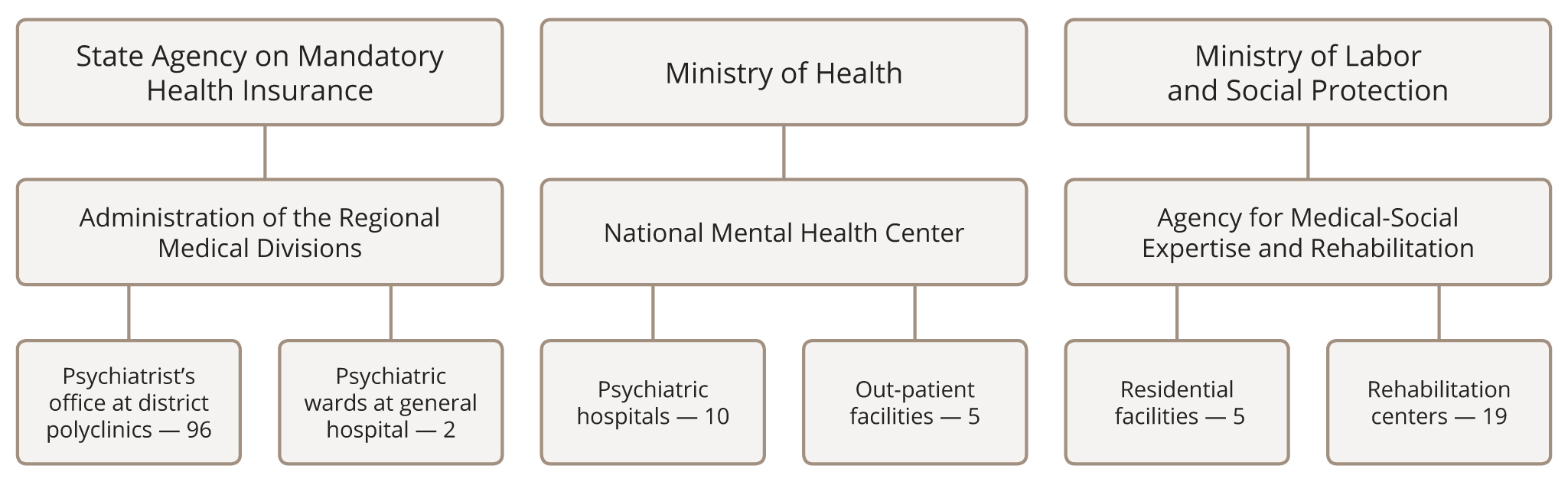 The healthcare system is currently in the process of large-scale reform as a result of which the majority of medical services were transferred to State Agency on Mandatory Health Insurance (SAMHI) financing, though certain facilities still continue to be financed by the Ministry of Health (MoH). The consequences of this separation have been most pronounced for mental health services: psychiatric hospitals and specialized outpatient centers are managed by the MoH, and mental health services in general health settings are assigned to the SAMHI. In this regard, mental health care provision has a significant number of conflicting approaches that influence decision-making processes. For example, improved access to community-based services is acknowledged to represent a better alternative to institutionalization; however, only 15% of the mental health budget is allocated to outpatient care. Another example is a general recognition of the need to introduce a multidisciplinary approach in care provision, but rate at which new positions are becoming available for mental health professionals is extremely slow. Development of community-based mental health services requires effective collaboration not only within the healthcare sector, but also with other stakeholders, in particular social welfare and education [3]. Unfortunately, mental disorders and mental disability are still managed from within the framework of a rigid medical-centered model that effectively prevents the delivery of comprehensive care, including psychosocial interventions, sheltered housing, vocational training, supported employment, etc. In the absence of well-developed social services, most people with mental illness have reported unmet needs with regard to their daytime activities, occupations, and socialization [4].