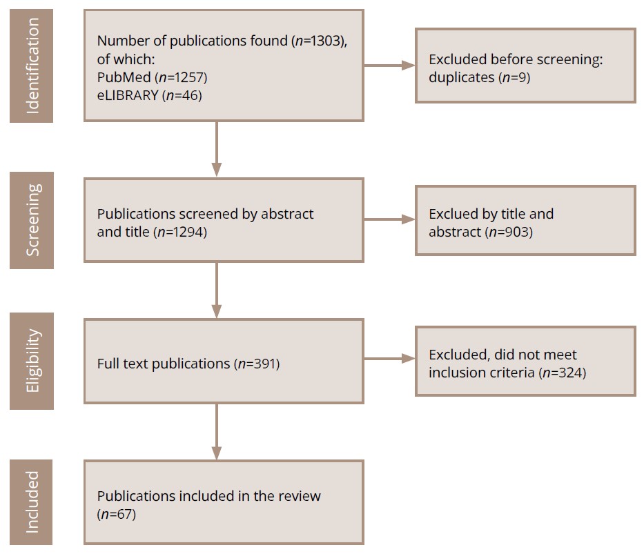 The number of publications in the initial search query by keywords in the PubMed was 1257; in the eLIBRARY — 46. In accordance with the inclusion criteria, 67 publications were selected (including the three works mentioned above [8–10]), of which 56 were in English, 11 were in Russian, including ICD-9, ICD-10, ICD-11 and DSM-5. The number of publications over the past 10 years amounted to 47 (70.1%).