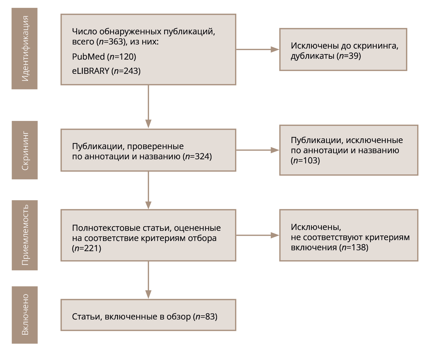 Отбор каждой публикации произведен посредством ручного поиска. Над поиском и отбором публикаций работали несколько специалистов, входящих в коллектив авторов настоящей работы (см. разд. «Вклад авторов»). Часть публикаций, отобранных на этапе скрининга, не была допущена к дальнейшему анализу, поскольку не соответствовала критериям включения.