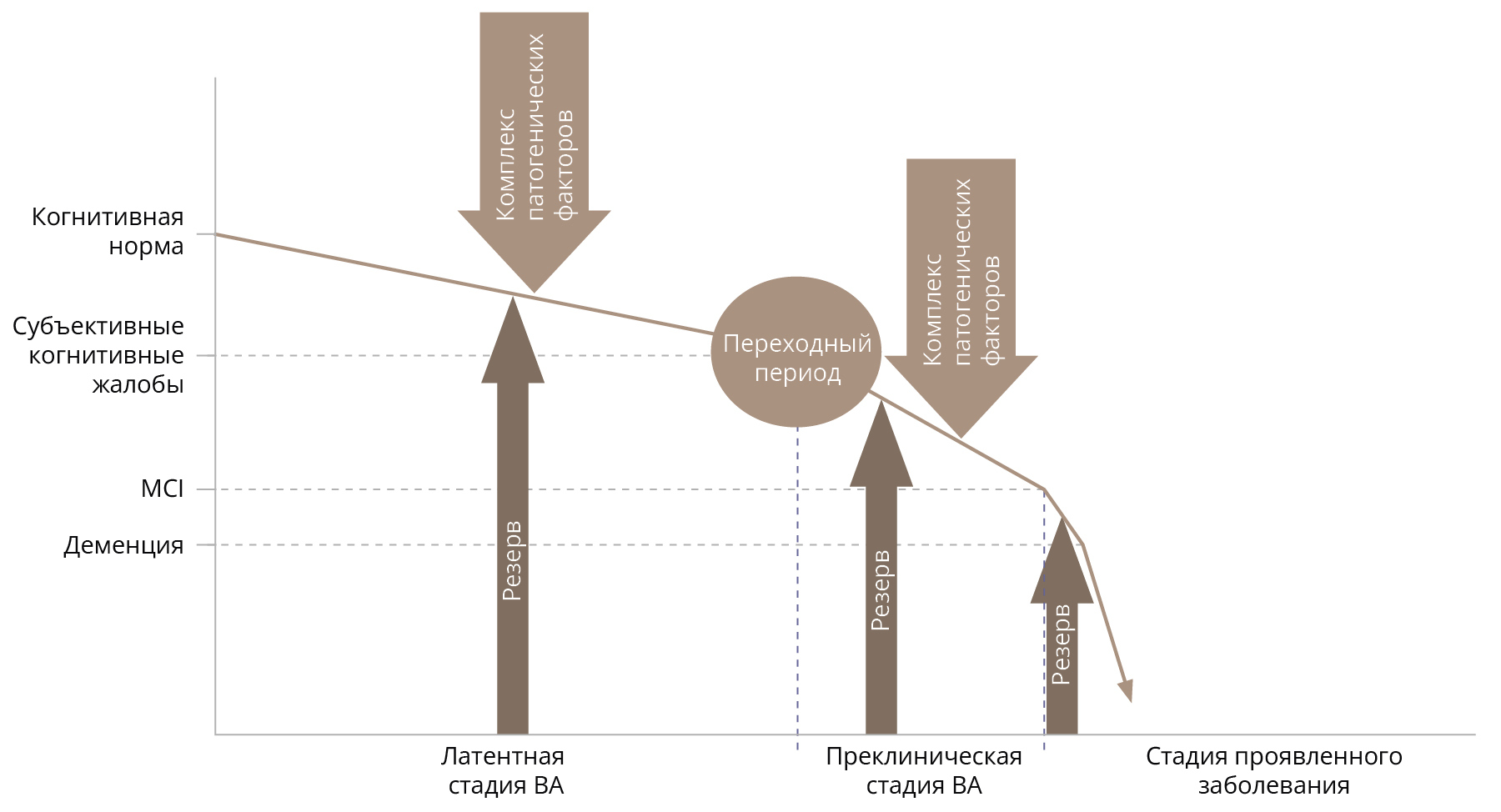 Переход латентного додементного периода в феноменологически проявленную стадию БА зависит от взаимодействия патологических и защитных (протективных) факторов. Вероятно, наличие КР препятствует переходу БА в клиническую стадию у части носителей биомаркеров БА [18]. Иными словами, люди отличаются между собой способностью справляться с изменениями, возникающими в результате старения, болезней или травм головного мозга. При этом пациенты с БА, имеющие феноменологически схожие проявления заболевания и сопоставимый когнитивный дефицит, могут иметь различные патоморфологические изменения в головном мозге. Возникает вопрос: какова мера устойчивости мозга в отношении патогенных воздействий? Также остается неясным значение церебральных саногенетических механизмов и роль церебро-когнитивного резерва (ЦКР) на латентной и клинически проявленной стадиях заболевания.