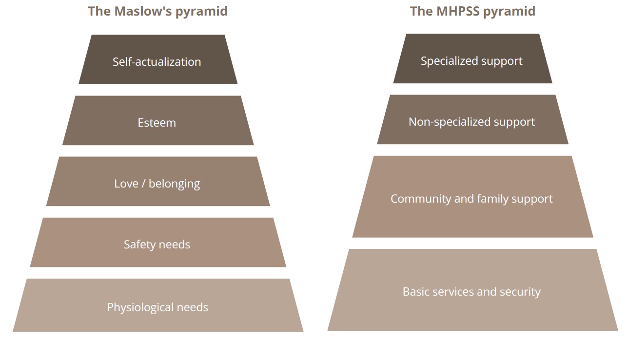 Figure 1. Illustration of the The Maslow's pyramid and the Mental Health and Psychosocial Support (MHPSS) pyramid.