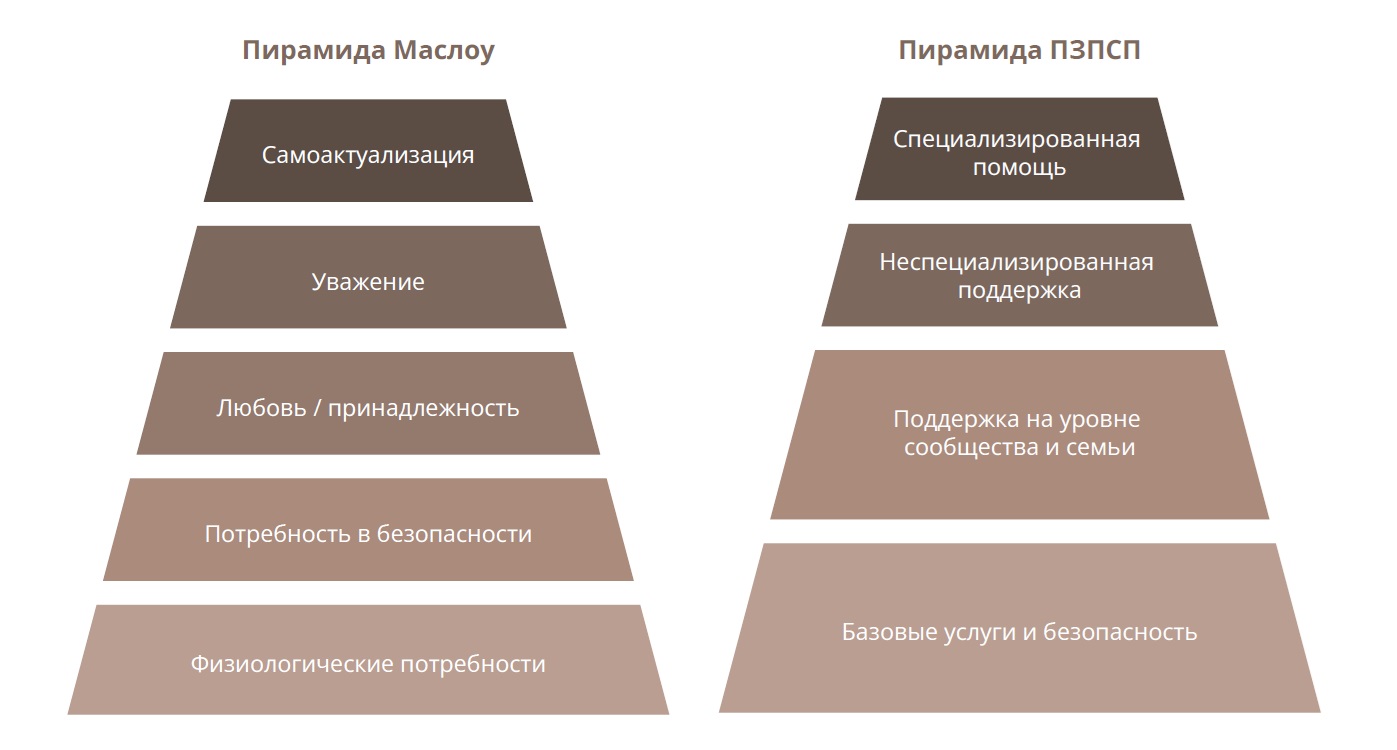 Two widely used models for understanding human needs and psychosocial needs are the Maslow's hierarchy of needs (Maslow's pyramid) and the Mental Health and Psychosocial Support (MHPSS) pyramid of intervention. The concept of pyramid diagrams is often used to represent the hierarchy of needs or levels of importance in various fields. In humanistic psychology and psychosocial support in humanitarian settings, two of these pyramid diagrams are the Maslow's pyramid of needs and the MHPSS pyramid.