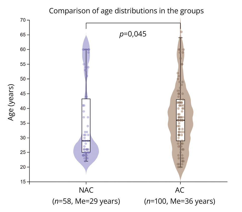 The distribution of study participants by age and sex in the AC and NAC groups was heterogeneous (H=4.008; p=0.045 and χ2=4.990; p=0.026, respectively). Although the median age and interquartile range in the AC and NAC groups were within the same age category according to WHO criteria, the distribution of participants by age was significantly different: participants aged about 40 years prevailed in the AC group, whereas the NAC group had 2 peaks at approximately 25 and 60 years (Figure 1).