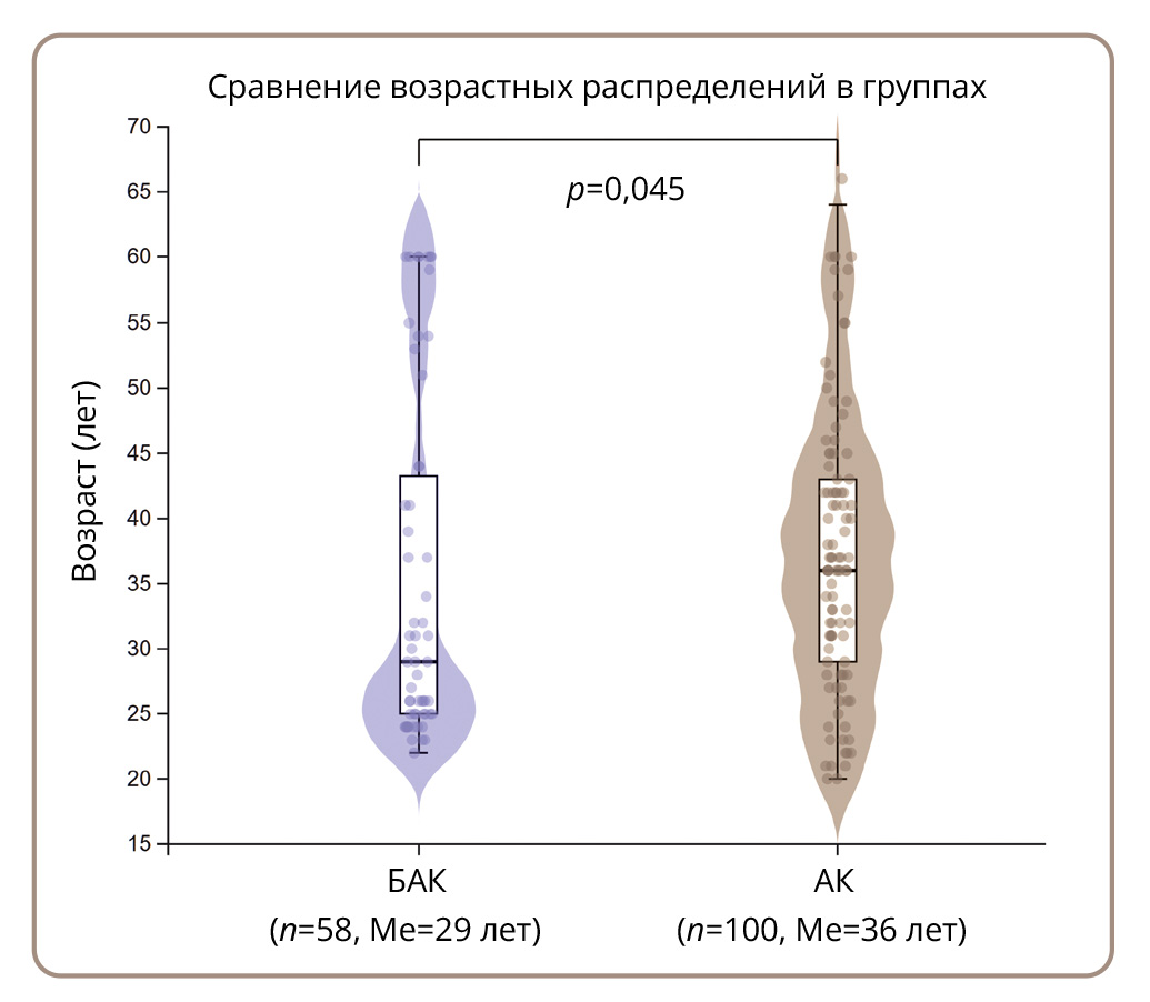 Age, Me (IQR) | 36.0 (29.0; 43.0) | 29.0 (25.0; 43.3) | 34.5 (26.0; 43.0) | H=4.008, p=0.045, ε²=0.026 | |