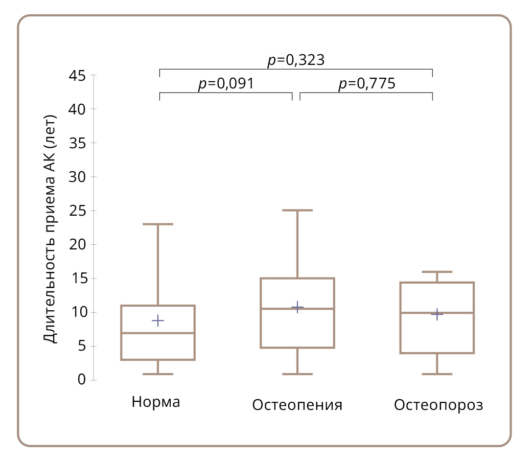 The results of the study demonstrated that patients with epilepsy have no statistically significant differences in the BMD decrease compared with healthy subjects, which is not consistent with previous research into the effect of anticonvulsants on BMD. The study also yielded conflicting data on the effect of the duration of anticonvulsant therapy on changes in BMD. However, long-term anticonvulsant therapy was found to be associated with an increased fractures risk. The results of the study highlight the importance of further studying the impact of antiepileptic therapy on bone health and the need to develop strategies to minimize the fractures risk. The development of a set of measures to prevent anticonvulsant-induced osteoporosis is an important undertaking, since the main goals of healthcare remain the prevention and prophylaxis of diseases, and the preservation of the life quality and working ability of the population.