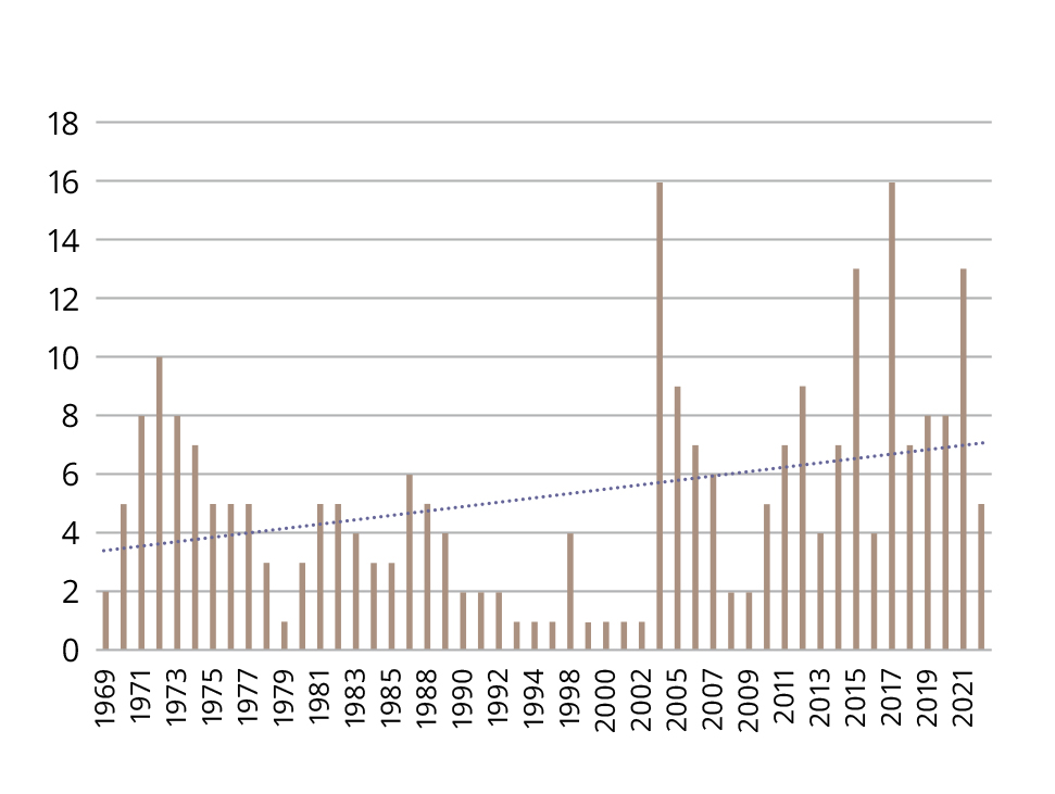 Figure 1. Citations of the paper by Lapin I.P. and Oksenkrug G.F. (1969) over time in articles related to etiology and pathogenesis of psychiatric disorders.