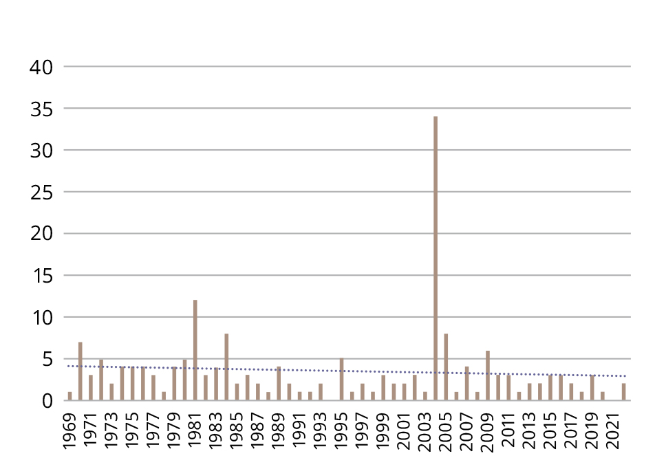 Figure 4. Citations of the paper by Lapin I.P. and Oksenkrug G.F. (1969) over time in broad-subject publications beyond neuroscience.
