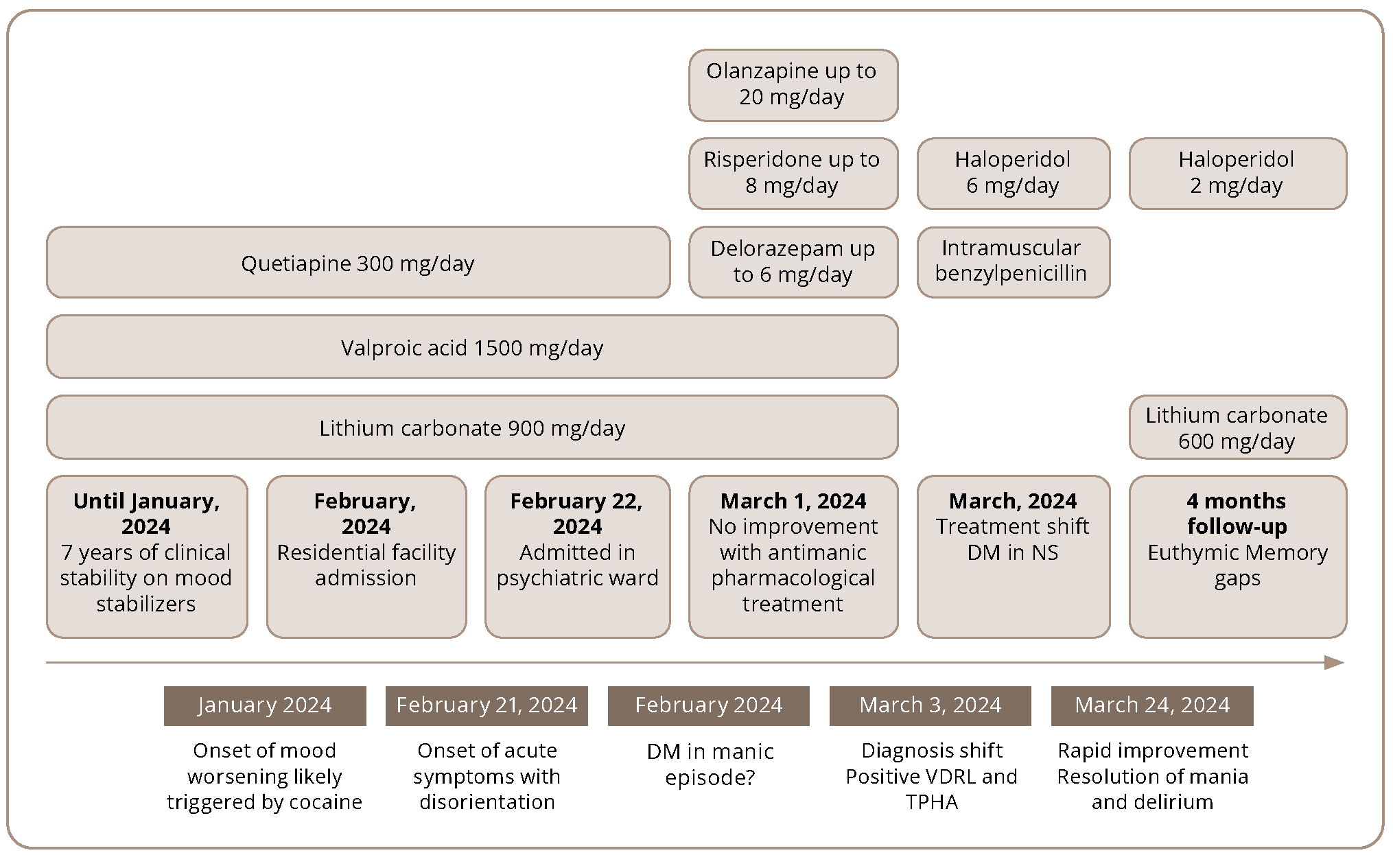 Given the lack of improvement with standard therapy for a manic episode, as expected under Bond’s sixth criterion [7], together with the absence of response to the withdrawal hypothesis and the positive TPHA test, we considered a diagnostic reorientation toward possible NS to be appropriate, based on our clinical judgment.