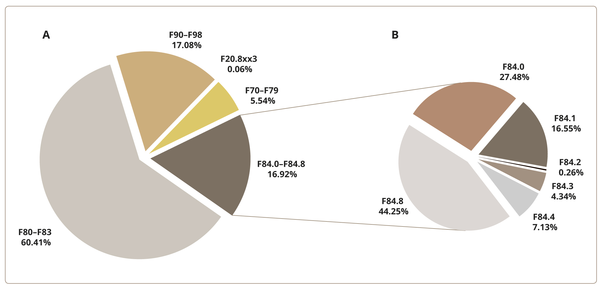 The group of “specific disorders of psychological development” (F80–F83) constituted 60.41% of the sample and prevailed over other MBDDs (Figure 1a). This group included the specific disorders of speech and language development, progress in educational skills, development of motor function, and mixed disorders of mental development. It is important to note that children diagnosed with F80–F83 are of special interest to clinical psychologists, psychiatrists, and pediatricians because of the possible deterioration of their state in the absence of adequate help and treatment. The next two most frequently observed groups were behavioral disorders, including hyperkinetic, emotional, and behavioral disorders (F90–F98), comprising 17.08% of the overall sample, and the pervasive developmental, general psychological development, and ASDs (F84.0–F84.8), comprising 16.92% of the overall sample (Figure 1a). These groups were followed by mental retardation (F70–F79), comprising 5.54% of the sample. Early-onset childhood type schizophrenia (F20.8xx3) comprised only 0.06% of the sample (Figure 1a).