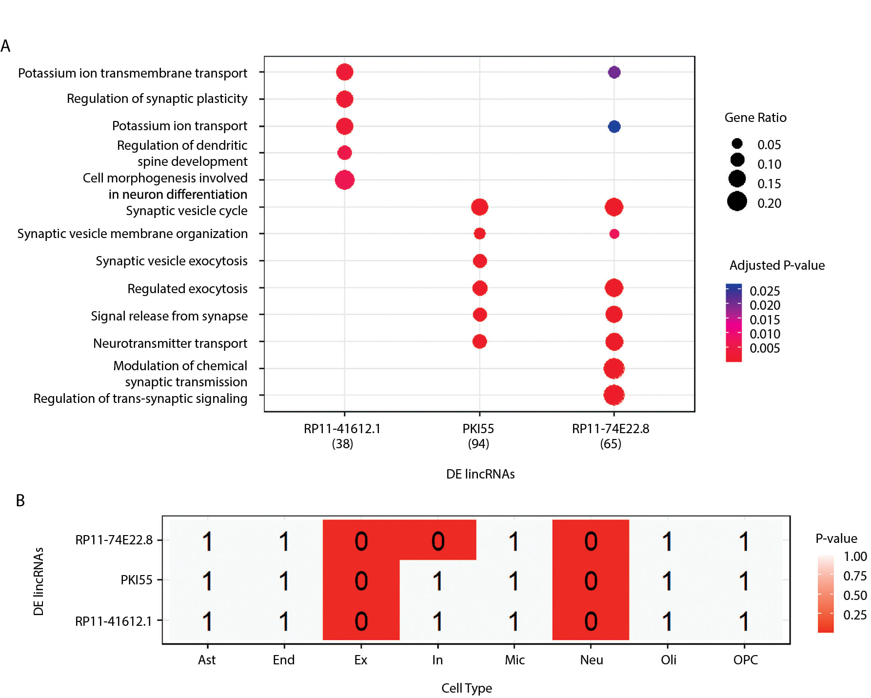 Figure 5. Annotation of three lincRNAs with the highest number of correlated mRNAs. Note: (A) Top GO biological process terms enriched in each target group. (B) Brain cell type markers enriched in each target group. Ast: Astrocyte, End: Endothelium, Ex: Excitatory neuron, In: Inhibitory neuron, Mic: Microglia, Neu: Neuron, Oli: Oligodendrocyte, OPC: Oligodendrocyte progenitor cell.