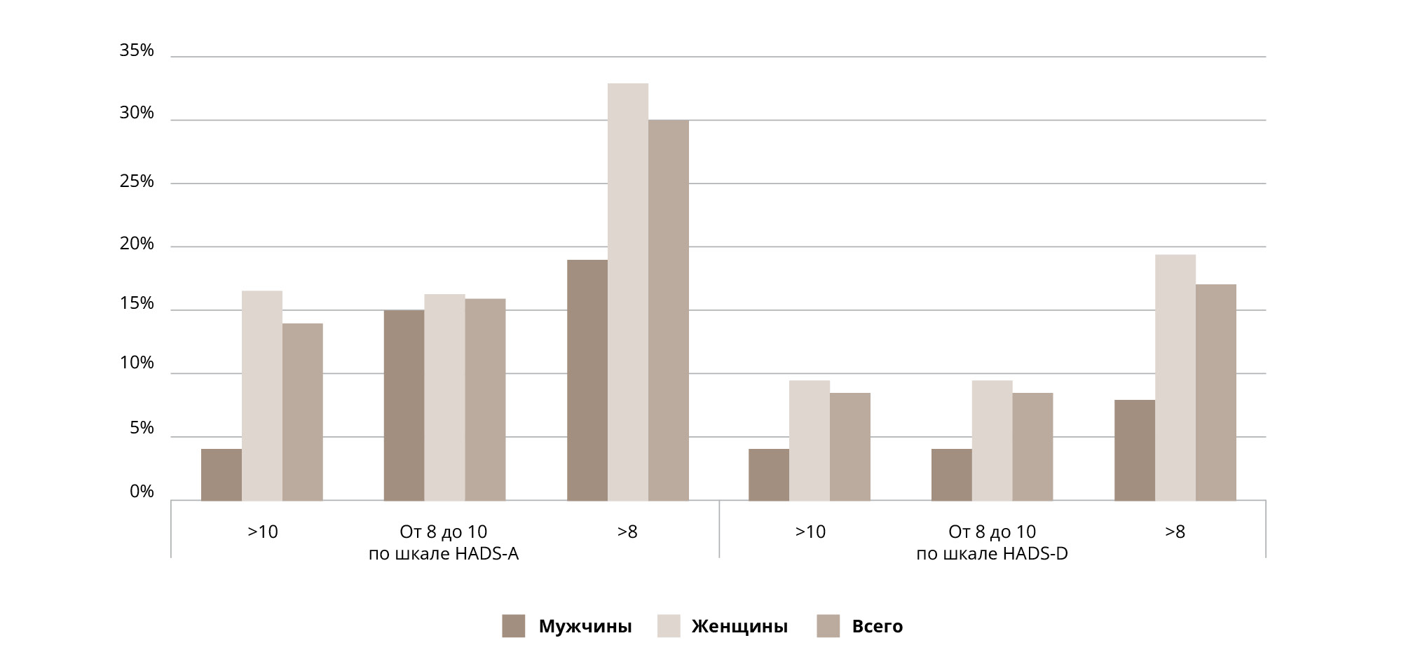 Results. In total, 352 responses were collected (men = 74, women = 278; age (M ± SD) = 36.81 ± 11.36 y.o.). Most respondents (n = 225, 63.92%) did not have any personal experience of the coronavirus infection. Normal levels of anxiety and depression scores were prevalent in the sample. Higher than normal levels of HADS anxiety/depression (> 7 scores) were observed in 105 (29.83%) and 59 (16.76%) respondents, respectively; mean (95% CI) scores for HADS anxiety/depression were 6.23 [5.77, 6.68] /4.65 [4.22, 5.08] (women) and 4.20 [3.32, 5.09] /3.46 [2.63, 4.29] (men), respectively.