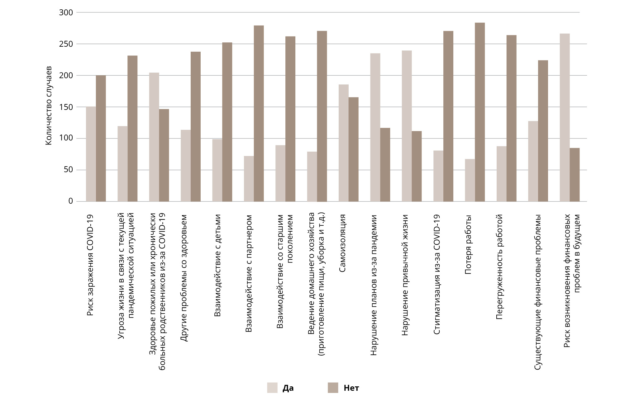 The leading causes of distress were found to be associated with financial concerns and self-isolation, and the health of elderly or chronically ill relatives. The risk of being infected with COVID-19 or concerns about the threat to life were not the main reasons for distress, nor was the fear of being stigmatized due to COVID-19. Difficulties associated with dealing with family members (children, a partner or elderly relatives) had even less impact on distress. These results do not correspond with assumptions made by the WHO about possible causes of distress (reflected in its information sheets) [25] or with the results of another survey carried out during the first week of the COVID-19 pandemic in Russia [26].