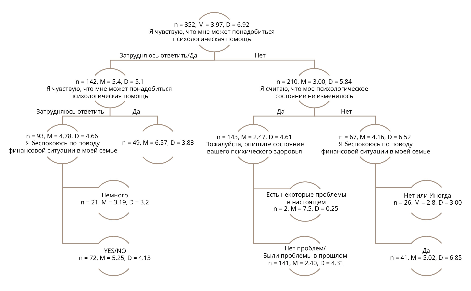 Our research sample was split according to the need for psychological support reported by respondents. Those who did not feel the need for psychological support had a lower mean score for distress (group size, mean distress level and variance: n = 210, M = 3.00, D = 5.84), while those who felt this need had a mean score of 6.57 (n = 49, M = 6.57, D = 3.83). Those who chose the "difficult to answer" option also had a higher level of distress (n = 93, M =4.78, D = 4.66). People in this group also had worries about family finances. Those who felt that they did not need psychological support could be split into two groups according to changes in their psychological condition ("yes" or "no" answers). Those who mentioned a change in psychological condition during the pandemic had higher levels of distress (n = 67, M =4.16, D = 6.52). Among these respondents, we also identified a group of people who had some concerns about family finances (n = 41, M = 5.02, D = 6.85) but who were not overly worried about this issue (n = 26, M = 2.8, D = 3.00).