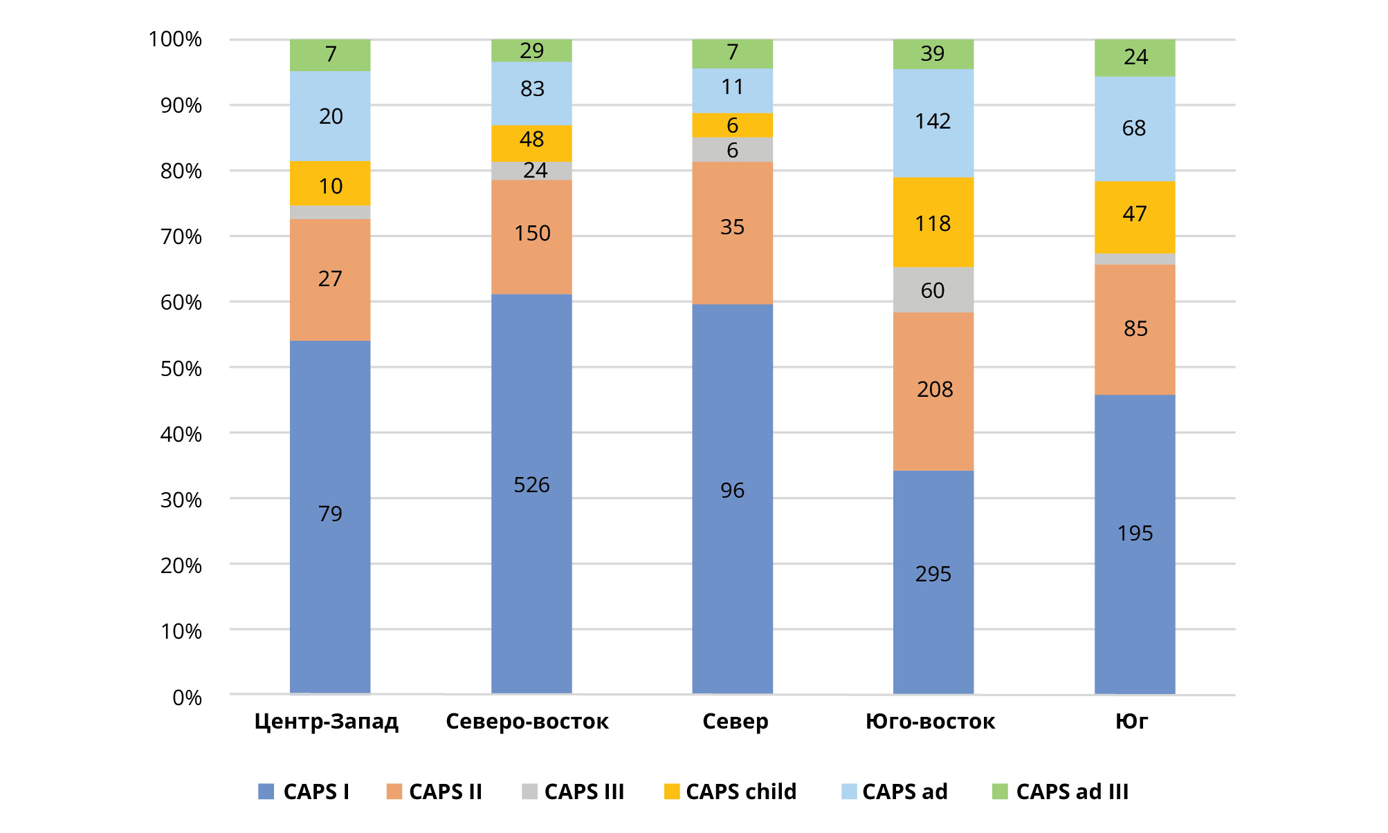 The growing number of community mental health services increased from 424 Centres of Psychosocial Care (CAPS) in 2004 to 3,013 in 2018. The number of CAPS per 100,000 inhabitants increased from 0.21 in 2004 to 0.86 in 2014 [6]. According to the Ministry of Health's indicators, a rate of between 0.5 and 0.69 CAPS per 100,000 inhabitants is considered good coverage and rates in excess of this are regarded as excellent coverage. According to the last report in 2015, CAPS are unequally distributed across the country, ranging from 0.38 to 1.57 CAPS per 100,000 inhabitants [6].