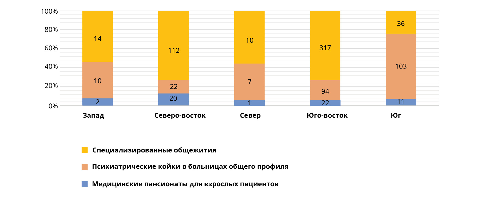 There is an unequal distribution of community mental health services across the country as shown in Graphs 1 and 2. The majority of CAPS services are concentrated in the South and in the southern half of the country, where 56% of the population lives. The majority of mental health services are located in the state of Sao Paulo, in the southeast of Brazil. This area accounts for 21% of the Brazilian population and 34% of Brazil' s GDP. Psychiatric beds in general hospitals are still scarce in the country and they are mostly concentrated in the South and southern regions (Figure 2). Residential facilities have also been created to accommodate patients discharged from psychiatric hospitals. Each residential service is located close to one CAPS, where mental health treatment is provided. In 2005, 9,000 people were living in Brazilian psychiatric hospitals and in 2014, 4,439 people were still living in 53 psychiatric hospitals in the state of Sao Paulo, in which long-term hospitalization was concentrated [19].