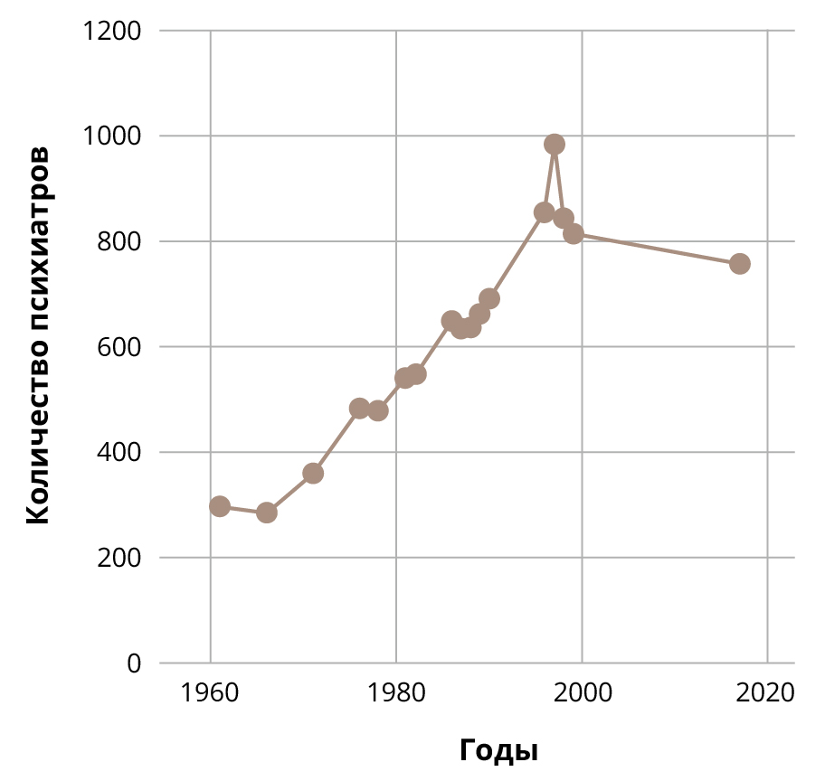 Рисунок 1. Количество психиатров за период 1960-2016 гг., согласно официальной статистике.