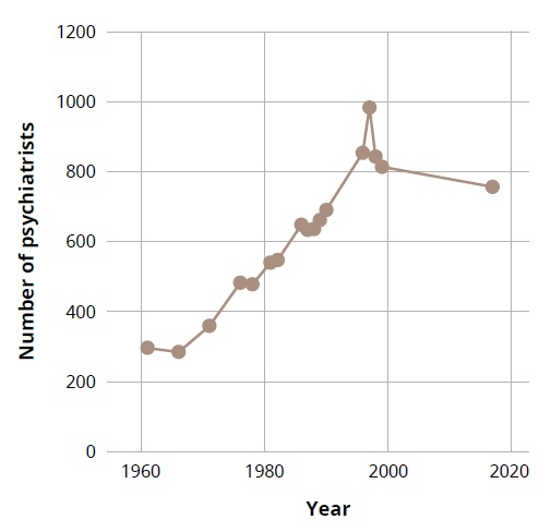 Figure 1. Number of psychiatrists for the period covering 1960–2016 according to official statistics.